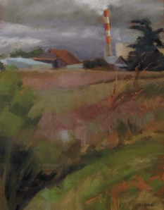This is my first plen aire painting with Vineyards and Vistas after the workshop. Loved the striped smokestack and the one of a kind enormous deodar cedar. I didn’t really have a plan beyond painting those and trying to incorporate my new arsenal of painting ideas. Looking at it now, I wish the smoke stack was more vertical. Mike Bergen Wonkiness creeps in. It is hanging at my first Corvallis show–at the Chamber of Commerce through July.