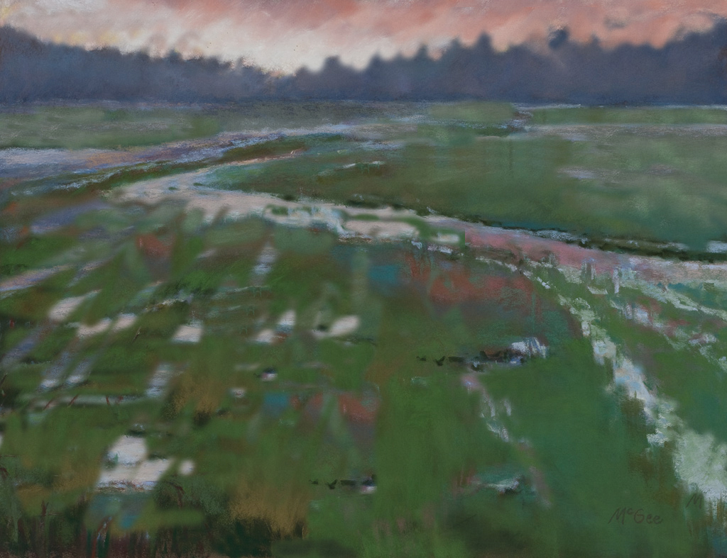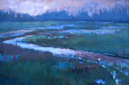 During the past few weeks I reworked an old painting and improved it substantially. This week I tried another. There are a couple of new directions I am considering. One is to add more lines of water leading to the horizon. The other is to crop the painting to 18×12 from its 24×18 current size. I will probably try the first (photoshopped below) and then move to the second idea if that doesn’t work. I changed the trees at the horizon and deleted the water on the lefthand side. I am enhanced the aerial perspective by greying and lightening the colors as they reach the horizon and darkened the piece to express the mood of early morning.